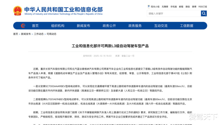 根据工信部发布的信息,重庆长安汽车股份有限公司和北汽蓝谷麦格纳汽车有限公司两家汽车企业,获得了搭载L3级有条件自动驾驶功能的智能网联汽车产品准入申请。